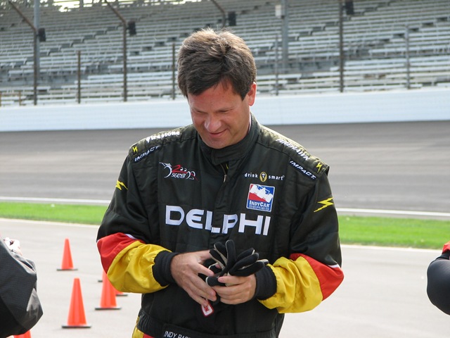 do in case something goes wrong. Then, they have you get dressed for the drive. They have a wide assortment of driver suits to choose from. I was looking for a Penske firesuit but had to settle for the old Scott Sharp style of the Delphi uniform. They had me don a balaclava along with driving gloves and even genuine driving shoes – the ones that have the ultra-thin soles.