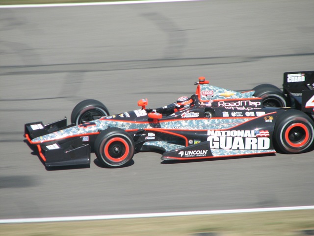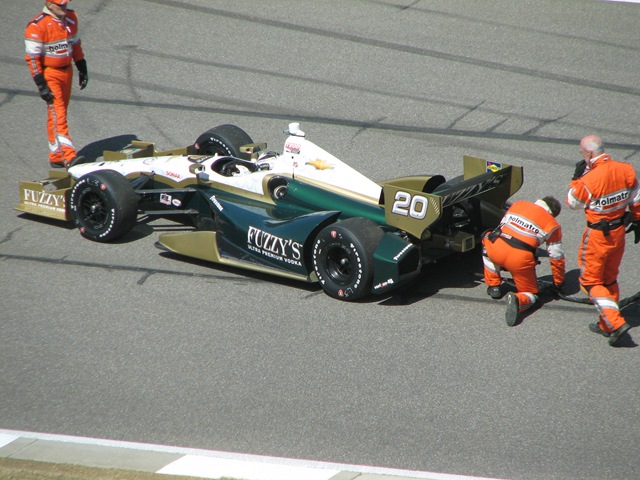 From the top floor of the museum, I was able to get some good pictures of the cars going through the turn. I also got a good shot of Ed carpenter’s disabled car. The Holmatro Safety Team could not get him refired and he had to be towed back to the pits, bringing a premature end to the final practice session.