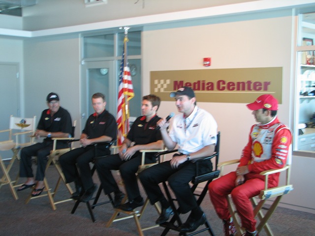 As I type, a press conference hosted by Bob Jenkins has started here in the Media Center with Team Penske. My traditional seat here in the Media Center is on the end of my row. I realized a crowd was gathering next to me as I typed. imagine my surprise when IO looked up to see Rick Mears, Helio Castroneves, Will Power, AJ Allmendinger and Tim Cindric standing right next to me. Needless to say, I stopped typing so I could listen in. There was no scoop except for Allmendinger saying what he had for breakfast. After the press conference got going, I figured it was worth my while to snap this picture that contains a four-time winner and a three-time winner. Pretty heady company…