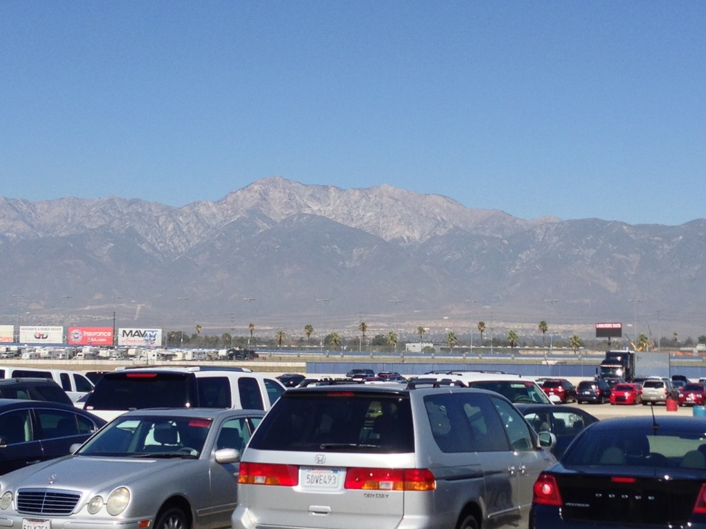 We arrived at Auto Club Speedway early Friday morning. The size of the place is surprising as you drive up. It’s not as long as going down Georgetown Rd, but the swooping grandstands along the main straightaway are very impressive. When we parked inside the track, the first thing you notice is Mt. Baldy that serves as a magnificent backdrop to the backstrech.