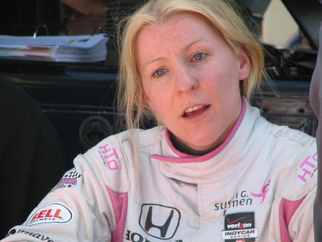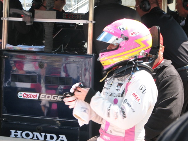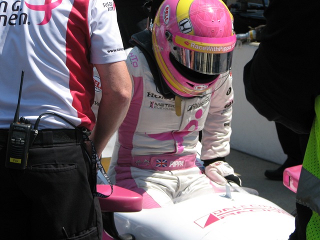 I do want to give a special shout-out to Pippa Mann, who had a great run in her Susan G. Komen car for Dale Coyne Racing. She qualified with a four-lap average of 229.223 and will start on the inside of the eighth row. I think she got just about all she could out of the car. She out-qualified both Foyt cars, former pole-sitter Alex Tagliani, two of the four Ganassi cars and two former winners. We happened to be in the pits as she was making her run and got a few shots of her as she climbed out of the car and debriefed with her engineer before her crew pushed it away.