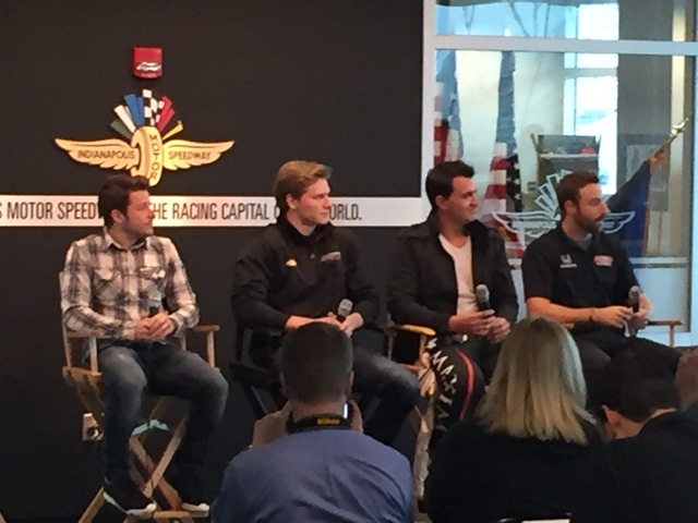 The day started with the rookies. Conor Daly (who showed up in a driving suit by mistake), Spencer Pigot and Max Chilton shared the stage with returnee Mikhail Aleshin. The only really noteworthy comment came from Daly. He found out after the season that he was held out of races by Dale Coyne late in the season in order to protect his rookie status for this year. He says although there are a couple of interpretations of the term rookie, he is under the impression he’ll be able to run for Rookie of the Year. Apparently, he was the last to know of this strategy and said he would’ve felt a little better about his status for a 2016 ride had he known of this strategy.