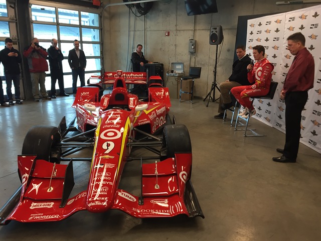 After a semi-delicious box lunch, we were taken to the Green Room beneath The Pagoda where Scott Dixon helped to unveil the “new” livery for his No.9 Target car. Longtime fans will recognize it as a throwback to the Target livery that Ganassi ran between 1996-2000. Ironically, as long as Dixon has driven for Ganassi – he never ran with the lightning-bolt scheme.