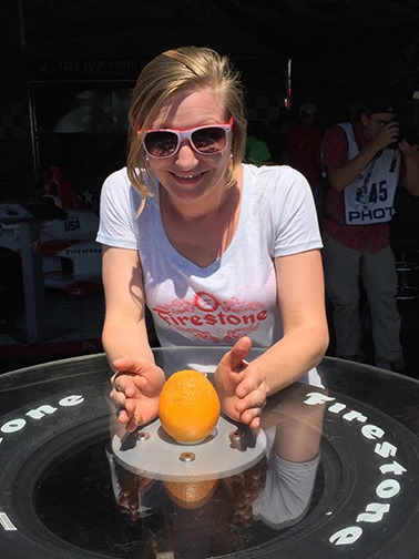 Then I came to the Firestone booth where they were holding the Race Andretti Sweepstakes–the prize being an all-expenses trip for two to the 100th Running of the Indy 500. This sweepstakes invites you to compete against Mario Andretti while doing smile, ordinary household tasks. Today’s race was peeling an orange–I made it it 19 seconds. I heard someone else did it in 5 seconds. Next week’s challenge is wrapping a vacuum cleaner cord around a vacuum–it starts tomorrow, so everyone who is skilled with a vacuum should participate. I don’t do the vacuuming around the house (I won’t tell who does), so I would be a poor competitor. Here is a clip about the sweepstakes.