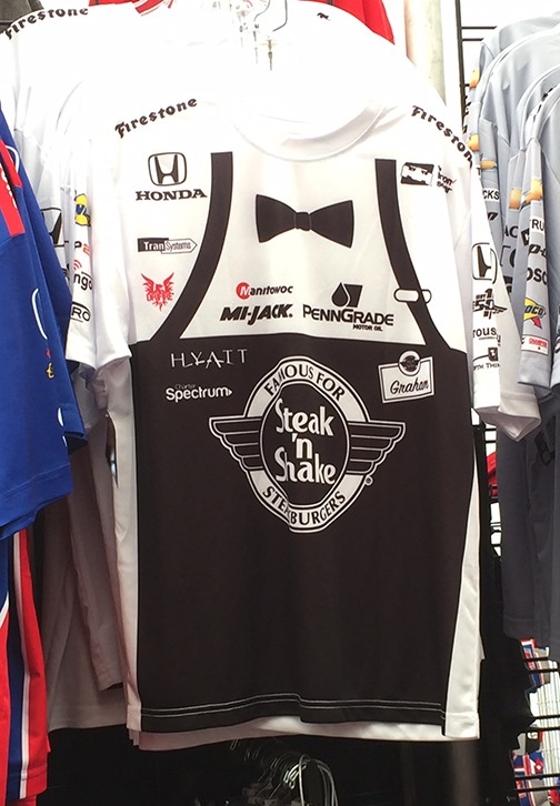 In the food area, there seemed to be a lot of new vendors. Steak and Shake had a large presence there–the lines sure were long. They offered a stuffed toy or a T-Shirt with purchase. I saw lots of kids walking around with the stuffed French Fries??? And a lot of adults with the I love Steak and Shake T-Shirts. I’m sure Graham Rahal would be too happy to sign them. Speaking of Graham Rahal, the most distinctive new shirt in fanwear was the apron and bow tie of Graham Rahal’s steak and Shake driver’s suit. I saw several people walking the grounds sporting this look.