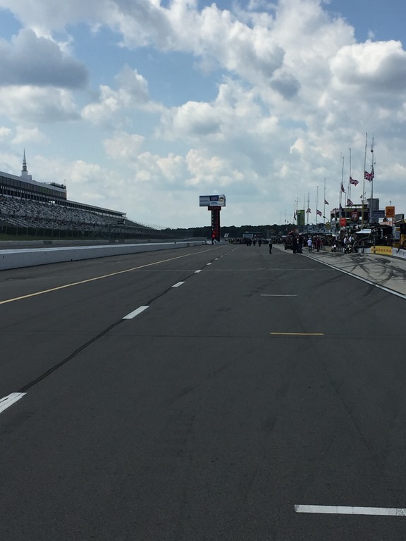 I was able to get a few photos while standing out in the qualifying line – most notably of Josef Newgarden suiting up and then about to climb into the car. I was also able to catch photos of Pippa Mann and Helio Castroneves, both gathering their thoughts just before their qualifying runs. Just before qualifying, I was able to catch a picture of Helio signing autographs for fans – a common occurrence. Before leaving the pits, I got a picture of the long pit road, looking back toward Turn Three. The photo does not adequately show just how long it is.