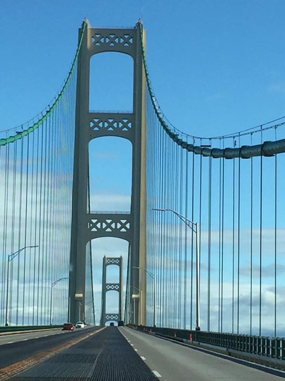 From there we headed north. Way north. To the UP, the Upper Peninsula of Michigan. Neither of us had been there, but had always wanted to go. George kept looking for a moose, but we did see a bald eagle soaring very low, right over our highway. We drove across the UP and over the Mackinac Bridge, known to the locals as the Mighty Mac.