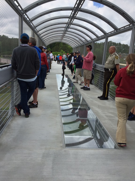 Looking down at Turn Three, you can see into the cockpit and actually see the drivers hands correct as the car gets squirrelly coming off of the turn. Another nice touch are the Plexiglas panels in the floor of the bridge where you can look through it and see the cars go through directly below you. Susan took this video through the glass. As I said, It’s a unique perspective.