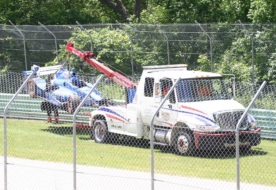 We then headed for the Carousel and watched about five laps. From there, we went to the inside of Turn Five and watched maybe three more laps before heading to the trail that runs alongside Canada Corner and Kettle Bottoms. We were going with the cars facing us, so we were going te opposite direction of the racing. That’s where we were when the Tony Kanaan crashed took place on Lap 46. We didn’t see it happen but came upon it just as they were carrying Kanaan’s car away.