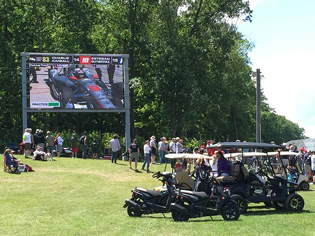 It is so well worth the money to rent a golf cart. Our 2-person cart cost $330 for the weekend. Don’t worry about getting your steps in–I still walked about 3 miles on race day–even with a golf cart. The golf cart is your ticket to get to the ENTIRE track easily without wearing yourself out. Here’s a short video from Kettle Bottoms through Canada Corner, which is just a fraction of the grounds. It can also help you scope out the best place(s) to view the race. With a golf cart, you can watch the race from more than one vantage point without schlepping your gear up and down the hills. There are jumbotrons around the grounds and it is first-come, first-serve for the best spot at the fence.