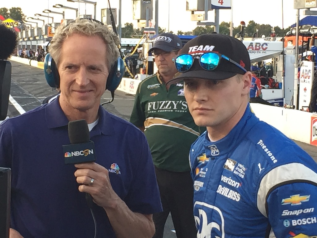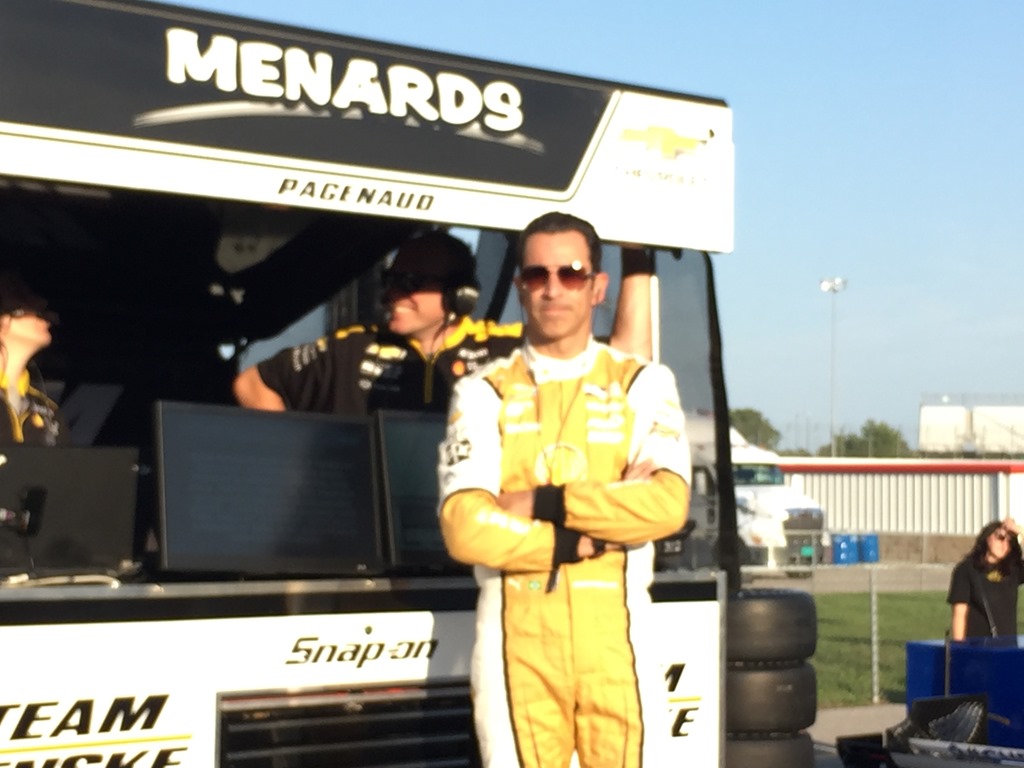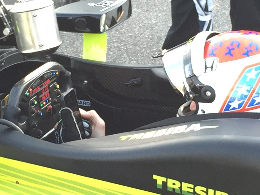 Susan finally made it to the track and got to the pits just as qualifying started. She and I were able to get some good photos during the qualifying session at the bottom of this post. You’ll notice the sun was still glaring in some of these shots, but it continued to get darker as the session wore on. Pay particular attention to the shot of Charlie Kimball checking lap times of his competitors on his Verizon App as he sits and waits for his turn in his car.
