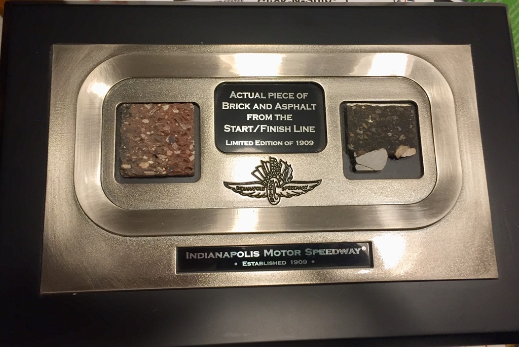 About ten years ago, Susan gave me a plaque made from the last resurfacing of the Indianapolis Motor Speedway, which took place before the 2005 race. It features a slice of brick and a slice of asphalt from the start-finish line, complete with a stripe of white paint on the top of the asphalt. The plaque says it is a limited edition of only 1,909. I guess there were just so many slices from a track that is only fifty feet wide.