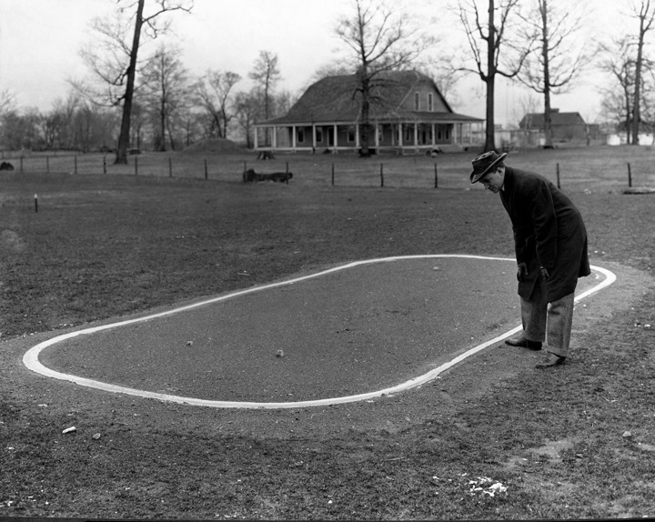 On March 9, 1909, while driving from Chicago to Daytona Beach, popular driver Lewis Strang stopped off in Indianapolis to view the proposed location of the soon-to-be-built Indianapolis motor parkway. He was greeted there with an 8-foot replica of the race track that was to be built on 320 acres of what had been known as the old Presley Farm along the Crawfordsville Pike northwest of downtown Indianapolis. Standing over replica, an unknown photographer captured Strang, resplendently dressed in suit, overcoat, brimmed hat, gloves, and wing-tip shoes, admiring this model and no doubt trying to grasp how this small-scale line in the dirt would soon come to life. Less than two weeks later, a team of local businessmen led by Carl Fisher would officially form the Indianapolis Motor Speedway Company. Work to bring the model to life would commence immediately.