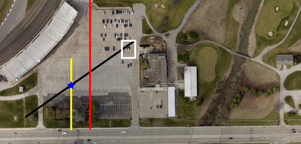 In the image below, the white rectangle is the outline of where the house stood as late as 1962. The black line is the line I believe the angle of the photograph is taken on. The red line is the original eastern property of the Indianapolis Motor Speedway from 1909, and the yellow line roughly indicates a distance from the original property line that is half of that distance between the property line and the house. The blue star at intersection of the black and yellow lines represents the eastern edge of where I believe the model track was located in 1909, though if one wanted to move the model one way or another along the black line, I think such an argument could be supported.
