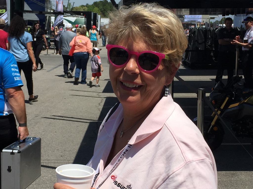 After practice we went and ate lunch and wandered through the paddock. I did take this one gratuitous photo of Susan in the garage area as the teams were working frantically on their cars to prepare for qualifying.