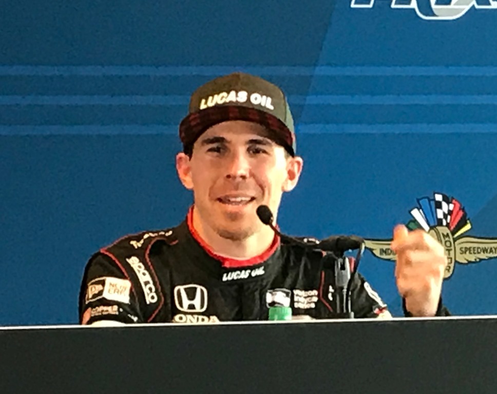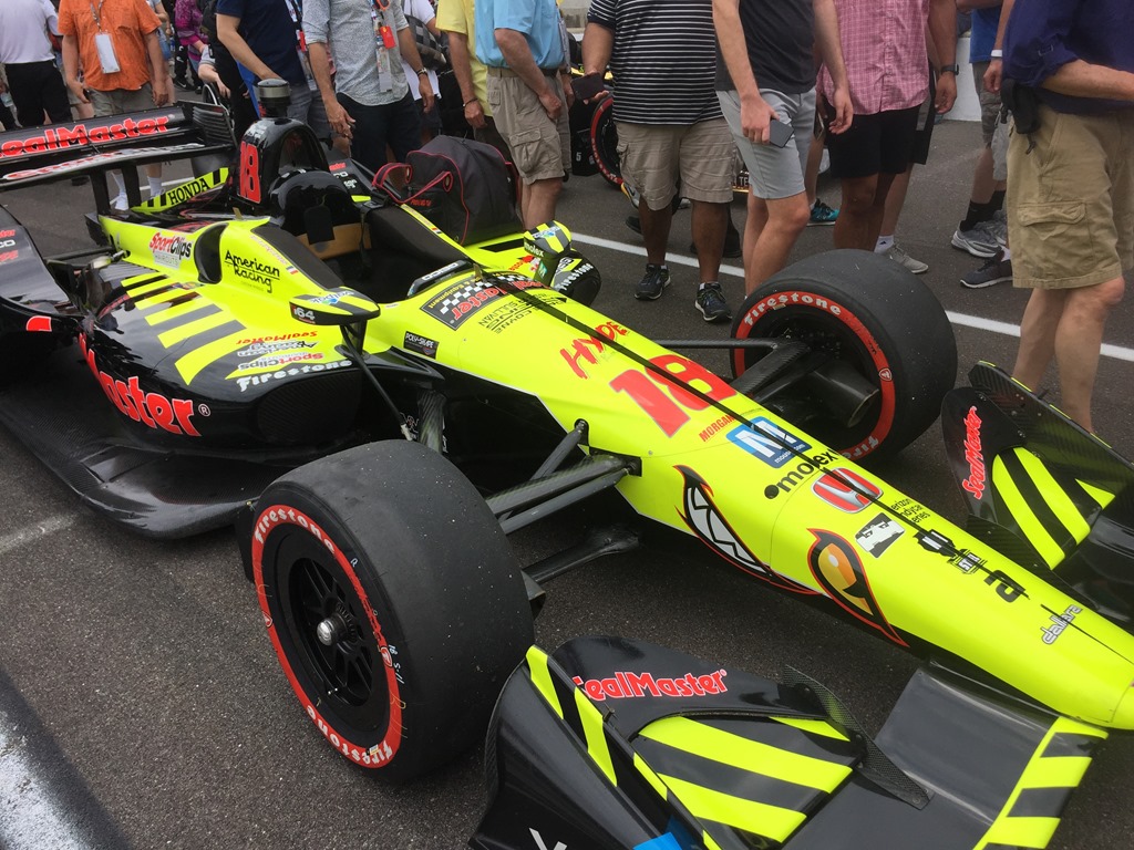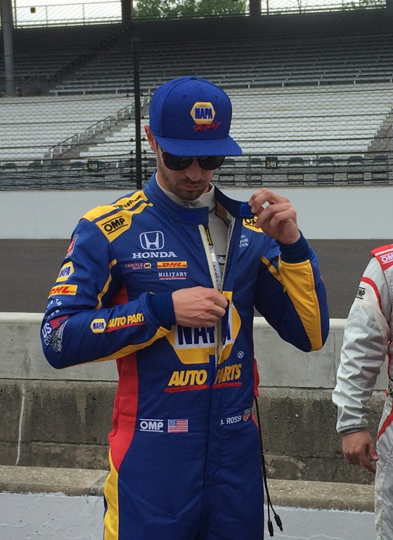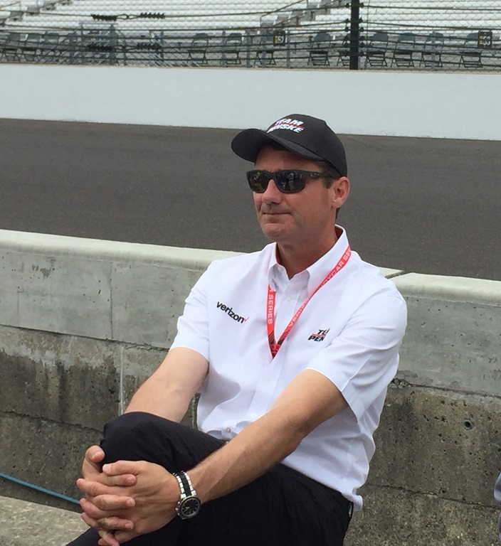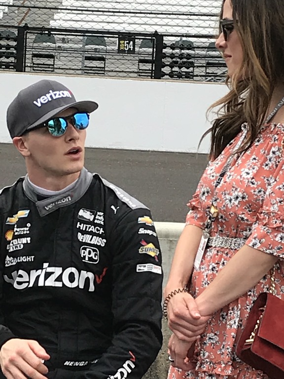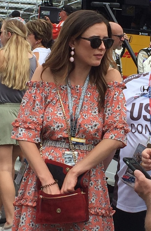 I will close with a series of photos that we took on the grid before the race. In keeping with longtime reader Ron Ford’s request, I got a couple of pictures of, not wives but girlfriends of drivers. The first is the girlfriend of James Hinchcliffe, and the second is Josef Newgarden’s girlfriend. But the rest are a hodgepodge of cars, drivers, Victory Lane, the post race press conferfences and one of Team Penske’s Tim Cindric relaxing on the pit wall just before the start of the race.