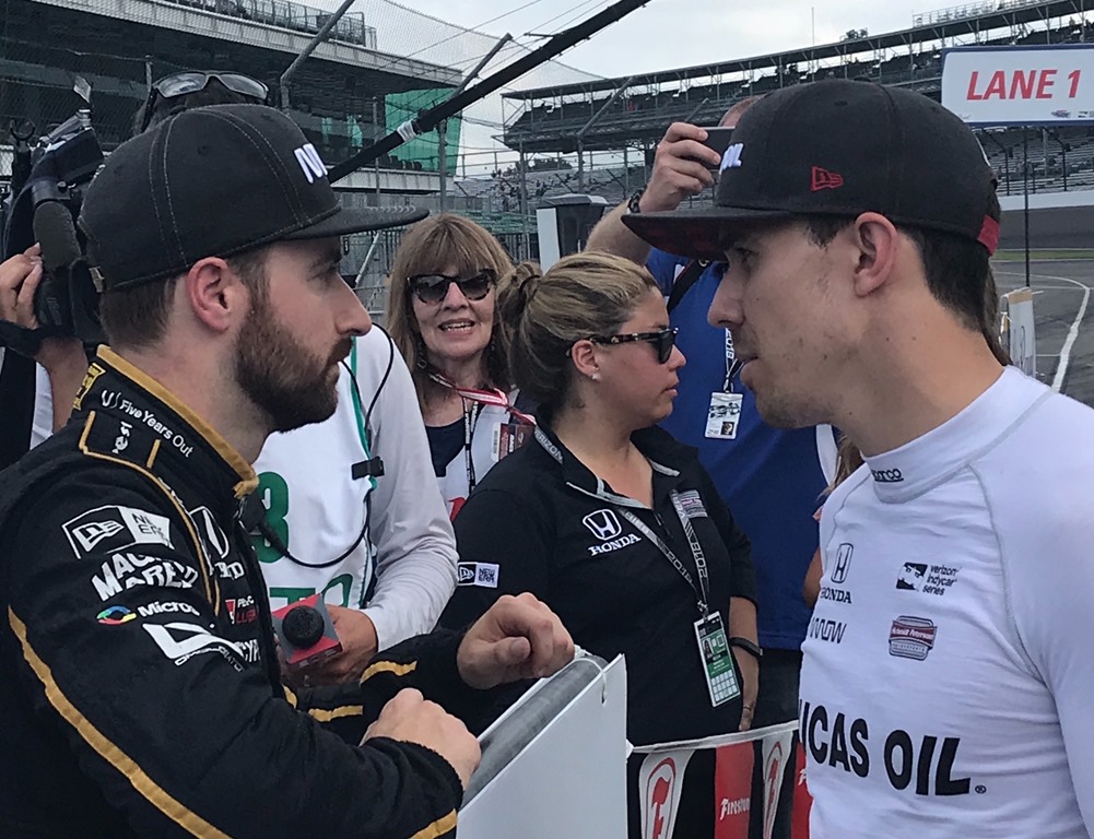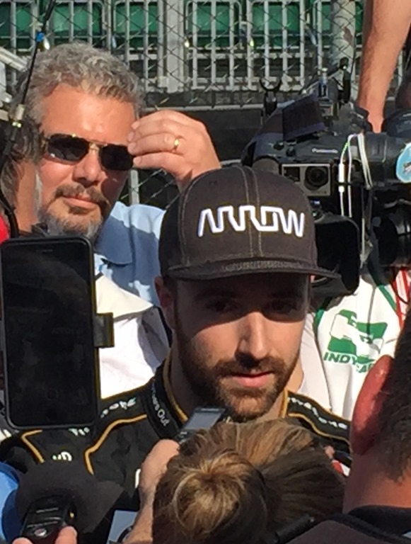 Although stunned, Hinchcliffe faced all of the questions that were thrown at him. He faced the music and didn’t flinch. Still you could see the hurt and disappointment in his eyes. I got a couple of shots as he faced the media just after climbing out of his car. Then Susan caught the moment when he and his best friend and teammate, Robert Wickens, offered his support.