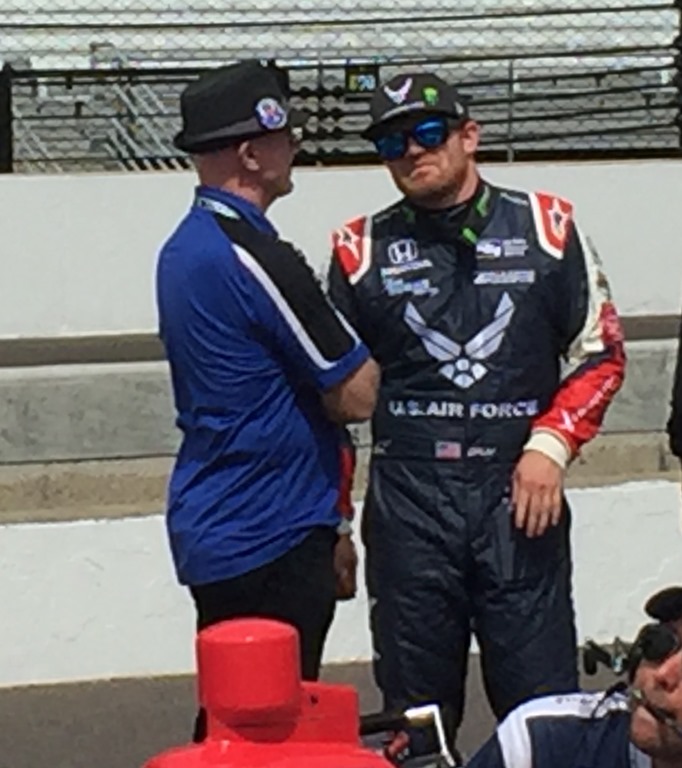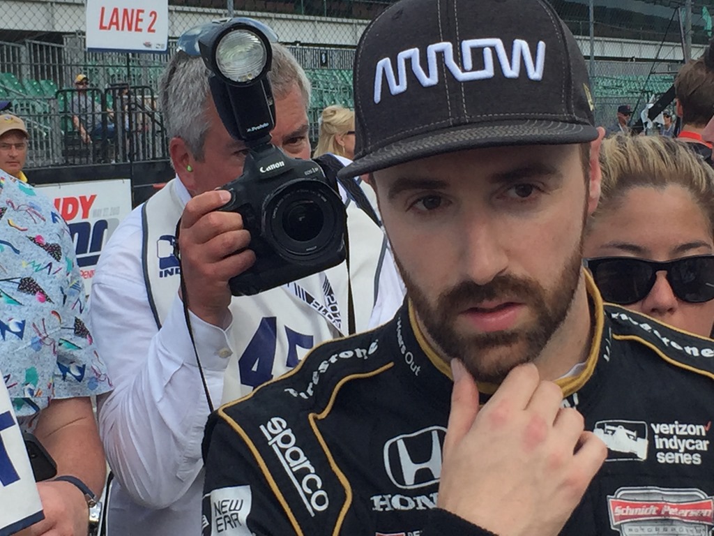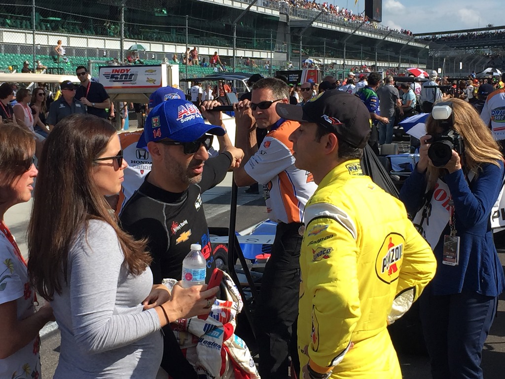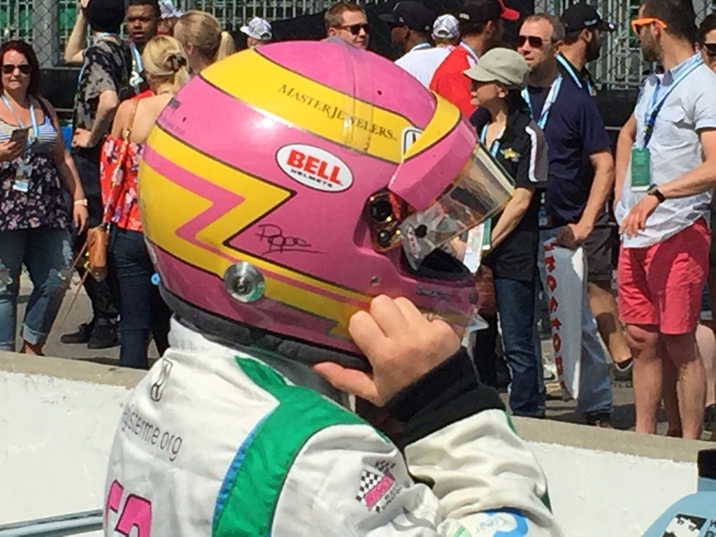 That will do it for today. Susan still has a few touches on her post, but promises to have it early tomorrow. In the meantime, here is a collection of random photos that Susan and I took today (along with a video I got of Alexander Rossi starting his qualifying run). Among the photos we got are Conor Daly chatting with his father, Derek Daly; Max Chilton’s wife Chloe; a happier press conference with some of the Fast Nine; Danica Patrick psing for a selfie with a fan; Helio Castroneves chatting with Tony Kanaan and his wife Lauren in the pits and others.