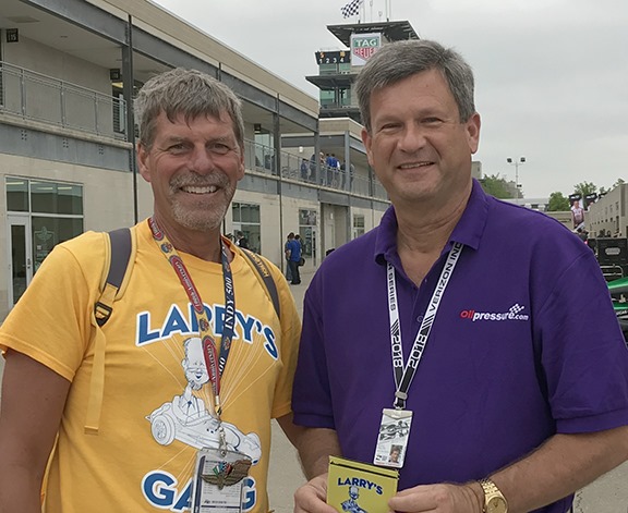 A perfect example happened Friday. We were roaming the garage area and came across someone who recognized George. He approached us and gave us two drink koozies labeled Larry’s Gang. George asked him to tell us about Larry’s Gang. Larry is his dad, who is now in his 80’s. He has been to every race since 1956. It is now a family event to come here every May. The family is scattered in Indianan, Chicago and other places, but they all get together in their seats in Turn Three.