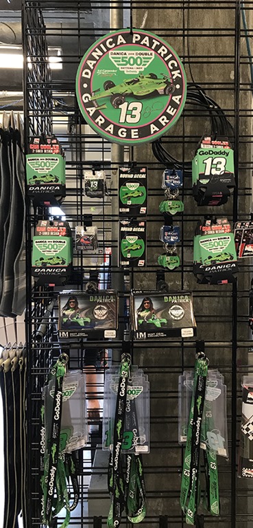 The gift shops did capitalize on the fact that Danica is back for one last IndyCar race. She’s always been well-represented with merchandise in the gift shop. This year you can buy a plaque with mini replicas of tickets of all of the Indianapolis 500s that she participated in and two commemorative coins. It is an autographed limited edition of 500. There are also lanyards, decals, and keyrings bearing the distinctive Go Daddy Green.