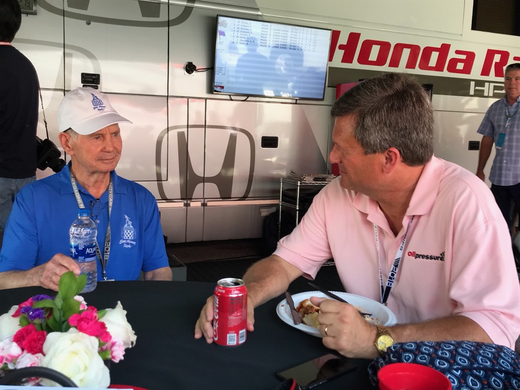 Just after the practice was over; Paul Dalbey, Susan and I went over to the Honda Hospitality tent for lunch. I noticed that Parnelli Jones walked in and I remarked to Paul “…there’s royalty in the house”. We continued with our lunch not really paying attention to anything. The next thing I knew, Parnelli himself came over to our table and asked if he minded if he joined us. My response? I said I would be honored.