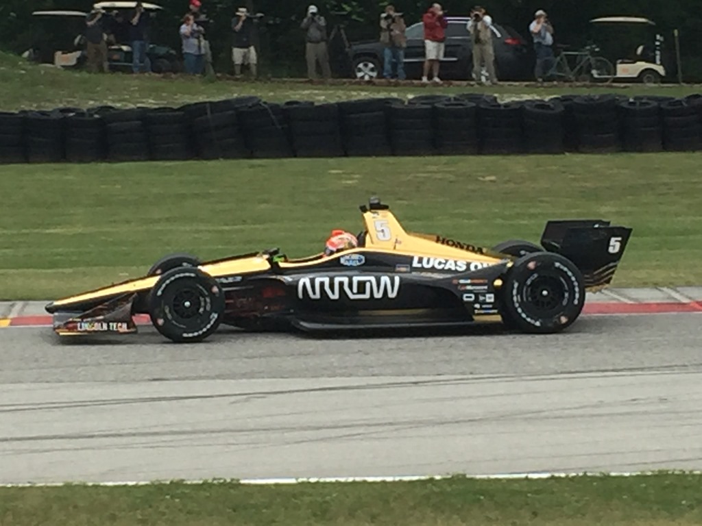 We started out at Turn Five, which is one of the premier points to watch the race, due to the overtaking that can take place there. Unfortunately, it’s not ideal for taking pictures due to the high fence. We stayed there for a while and then went up the hill, crossed the Corvette bridge and found a spot as they are coming out of Turn Six before heading toward the Hurry Downs portion of the track. The cars just climbed a hill so they are going relatively slow. There is also no fence to obstruct your view so it is a great place to photograph from. I took a few pictures myself along with a video of Marco Andretti going through that section.