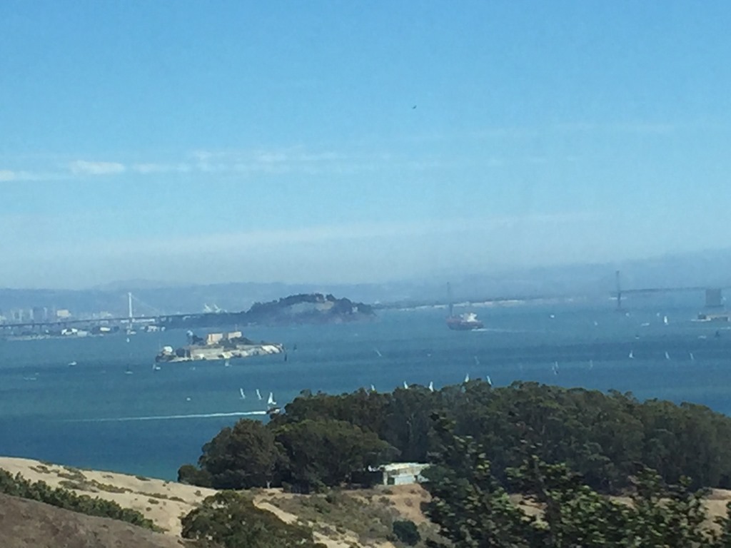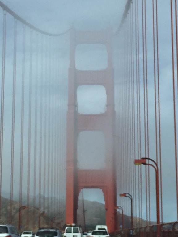 We crossed the Golden Gate Bridge and it was as impressive as I thought it would be, even though it was still somewhat shrouded in fog. Susan snapped this picture of the bay just after we crossed.