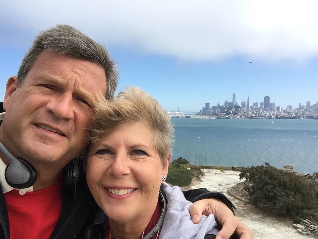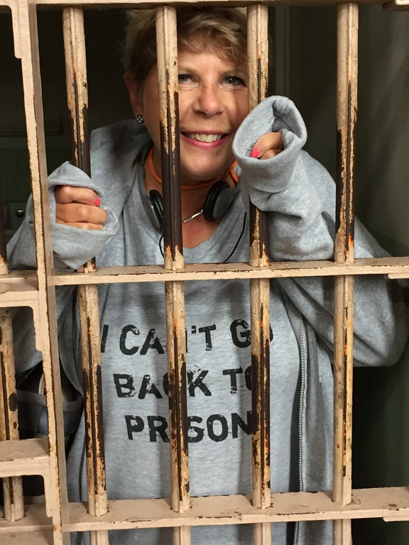 Why we were bumping up against time was because we had tickets to go to Alcatraz at 1:30. This was Susan’s idea, but it was a good one. We boarded the ferry that took us over to the island at 1:00…and yes, Susan wore her prison shirt.