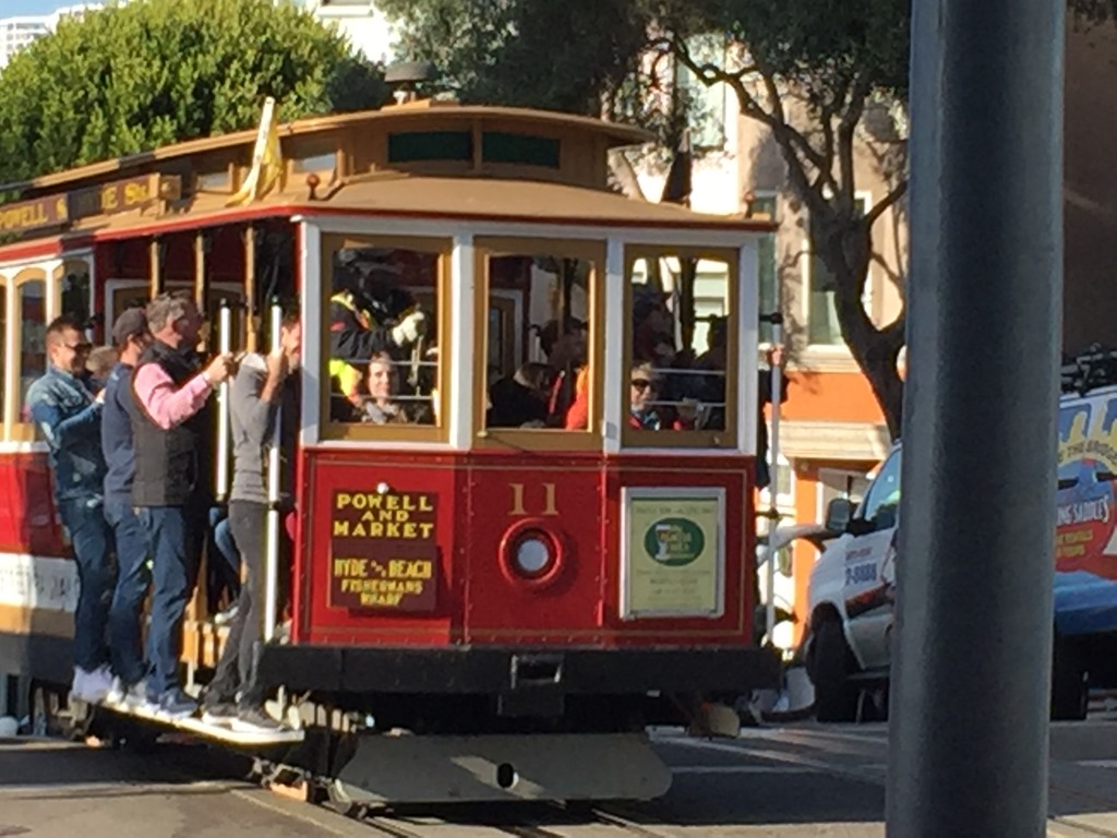 After an afternoon on The Rock, we were hungry. We took the chilly ferry back to the mainland and then tried to ride a cable car. I say “try” because we stood in line at rush hour for forty-five minutes and saw three go by. But there was no room so we said forget it. But we did get a nice picture of one, anyway.