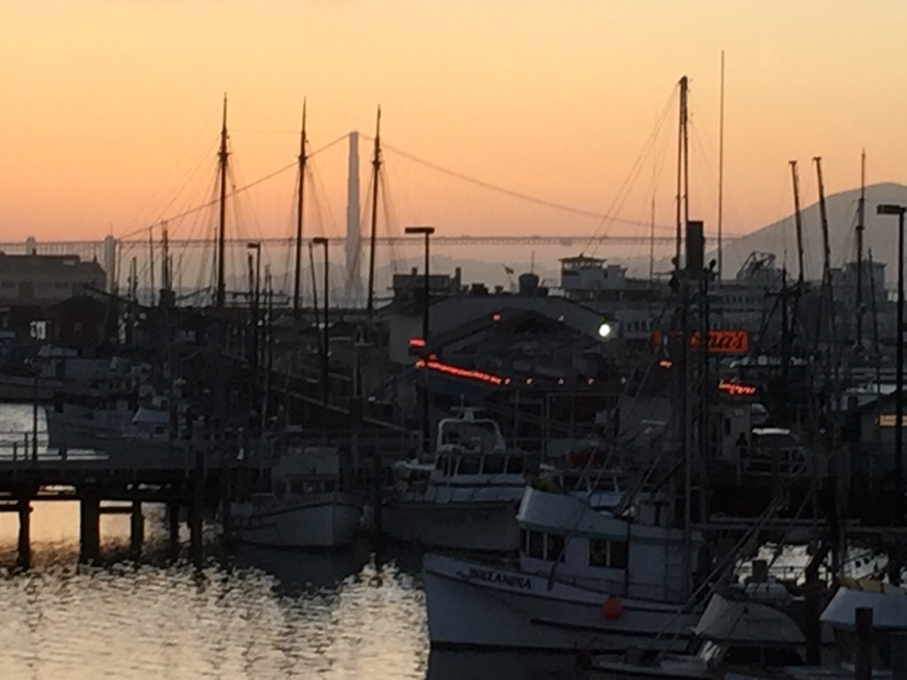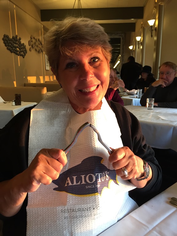 From that stop, we walked down to Fisherman’s Wharf. We looked over several menus but finally decided on Alioto’s Italian Seafood. It was a good choice. In fact, it was such a good choice, we would make it a point to go back there if we are ever there again. It has been there since 1925 and is very old school. If you like trendy restaurants with small portions, this is not the place for you. But the food was phenomenal. We had Dungeness Crab, the kind you have to wear a bib for.
