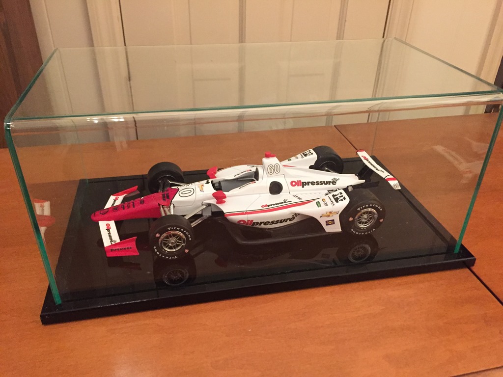 When he brought it home that night, I gave him the rest of his gifts – all of which had a racing theme. I got him the Scott Dixon video, a white button-down (100% cotton, of course) shirt with the Oilpressure logo, and a black man-purse with the Oilpressure logo embroidered on the side that he can take to races next season, to replace that Titans duffle-bag he uses. Lastly, I got him a clear plastic case to cover and protect the car.