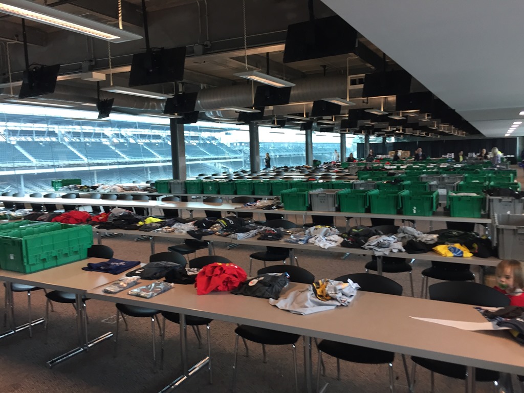 On all of the tables where everyone is assigned a seat in May sat bins and bins of polos, T-shirts, jackets and sweatshirts from seasons past that had not sold out. On other tables were die-cast cars that they were trying to unload at a substantial savings.