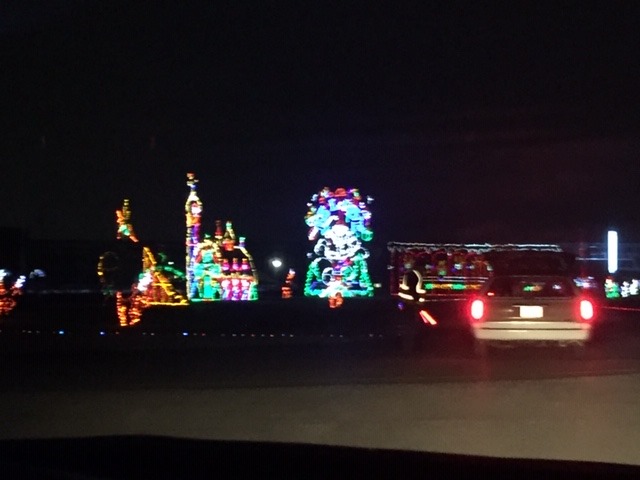 It was not as cold as it was last year when we went with snow on the ground. It was a rather balmy 42° when we went through. We got there at 6:08 pm, just eight minutes after it started. With it being only the second night of the season and early in the evening, there were only a few cars in front of us and the one behind us was stopping at every display. That meant we could go through at our own speed to check out all of the displays (and even take a few of the road course turns probably a little faster than track officials would like).