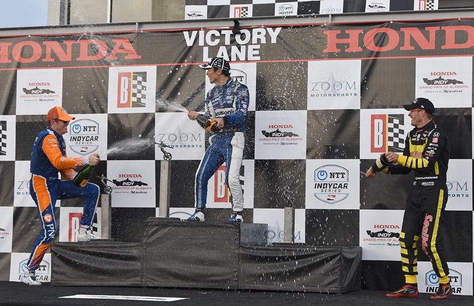 The tenth running of the Honda Indy Grand Prix of Alabama is in the books. Takuma Sato was in control all day – that is until Lap 85, when he went off course and ripped some of the underbody off of the car. That was about the only suspense up near the front. For just a second, you wondered if Scott Dixon would be able to take the lead in the last few laps and possibly win. It was not to be. This day belonged to Sato.
