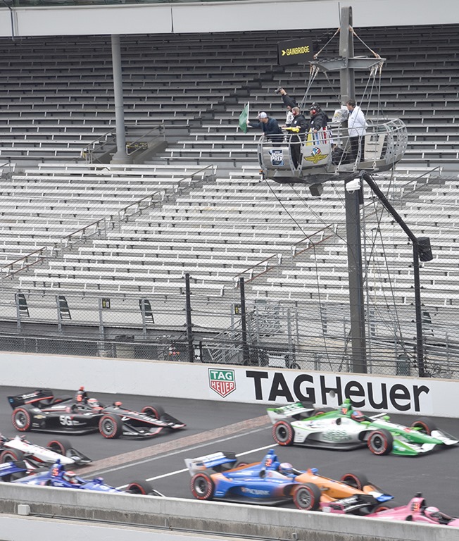 Just as the cars were fired, we felt a few drops. Normally, we sit in the Tower Terrace seats for this race. From there you can see the cars as they approach the yard of bricks and follow them all along the main straightaway down to where they dart into the infield portion in Turn One. There also happens to be a video board just across from us so we can see whatever is going on out of our line of vision.