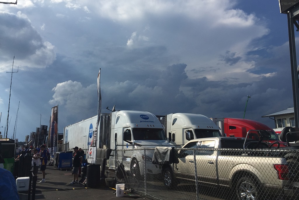All in all it was a very exciting race as we were standing near Liz Power when the race was stopped for lightning in the area. It had been a two-bottle race for her, as she stood clutching the mangled remains of two water bottles. Then Will came over to stand near us and the waiting game began for the weather to hit and the cars to return to the track or the race to be called in favor of Power. Then doomsday struck and we all ran for cover.