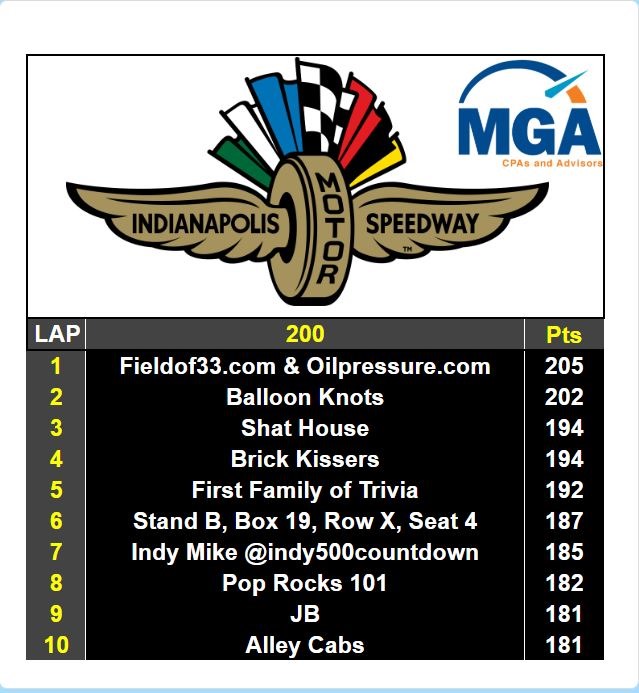 Some of the team names were very clever. Oh Me So Hornish, Willy P and the Wankers, Definitely Not Arni’s Team and Al Unser Taught Me the F-Word come to mind. Our team name of Fieldof33.com and Oilpressure.com was not very clever, but they gave no style points for team names in this contest.