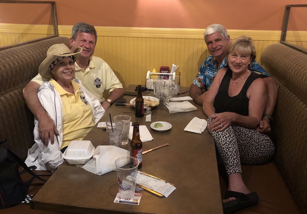 I will share three self-indulgent photos from yesterday. One of Susan and me in the pits before the race, another of the two of us in our seats during the race, then the last of the two of us, along with my brother Jack and his wife Karen while we were at Dawson’s on Main last night after the race. Paul Dalbey joined us and was kind enough to snap it for us.