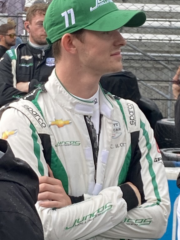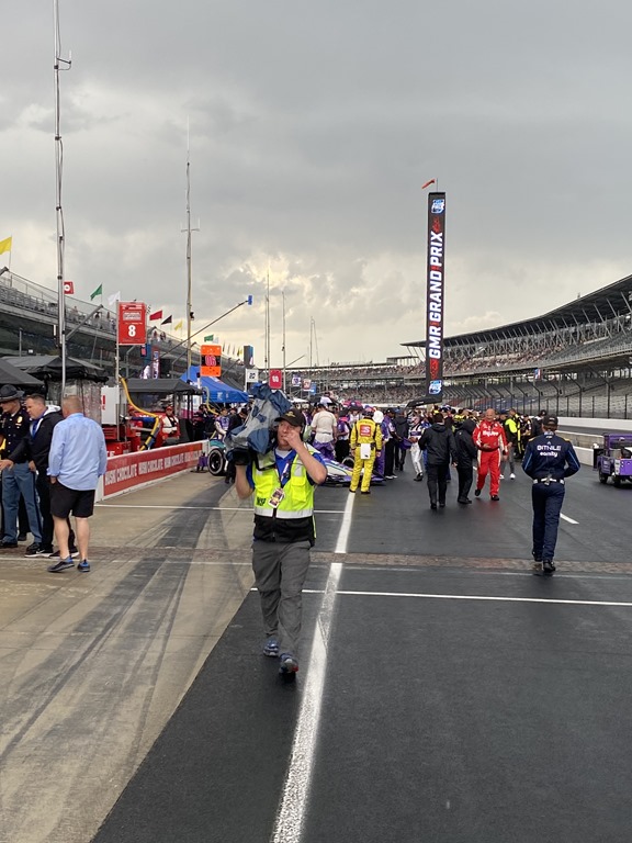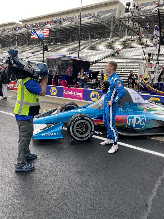 I was out there for the invocation and the National Anthem. The Star-Spangled Banner was played on an alto saxophone. It would’ve sounded great in a cocktail lounge, but not sure an outdoor sporting event was the right atmosphere. But as I’ve learned in some of my National Anthem critiques, not everyone shares my taste in what’s appropriate and what’s not. I did find it amusing that even in a solemn moment like the playing of our National Anthem, drivers are not immune to having cameras in their face, as proven by Josef Newgarden and this NBC cameraman. (All photos by George Phillips, Oilpressure.com)
