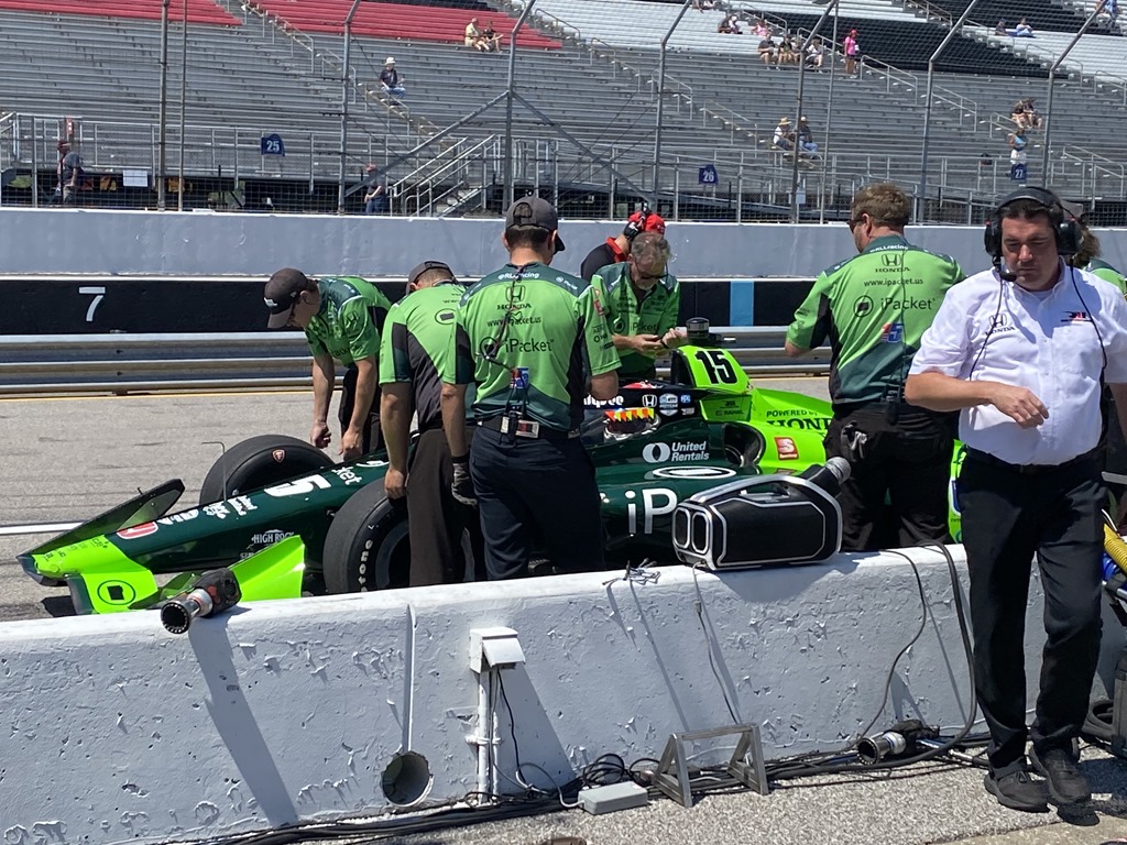 Graham Rahal is in a striking dark green/day-glo green car this weekend, that really looks good in person. Unfortunately, day-glo never shows up in print or television as it looks in person.