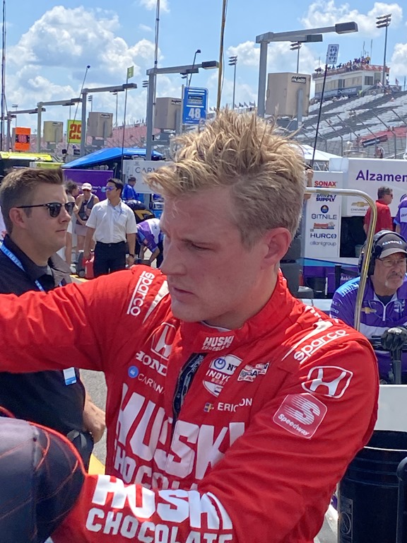 2018 winner Will Power led the practice with an average speed of 180.539 mph. Alex Palou was just a tick slower at 180.208 mph. Felix Rosenqvist was third quick, followed by Scott McLaughlin and Marcus Ericsson. Three teams in the Top-Five is not bad if you’re looking for parity. Pato O’Ward, Graham Rahal, Josef Newgarden, Takuma Sato and Scott Dixon rounded out the Top-Ten. Here is a shot I got of Ericsson, just after stepping out of the car. Forgive my mediocre photos. My photographer (Mrs. Oilpressure) is not here this weekend and is missed for many reasons.