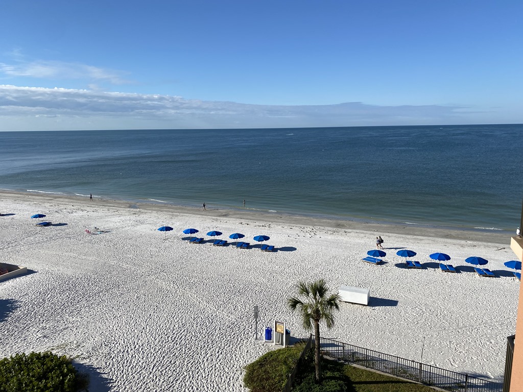 I am happy to announce that our fears were completely unfounded. We had no delays, no hiccups or surprises as we traveled from Nashville to North Redington Beach, Florida. Clear blue skies welcomed us as we checked into our condo. Again, there were no surprises as our accommodations were exactly as advertised. We had reserved the obligatory beach chairs and umbrella beginning Sunday, and sure enough – there was a set-up with our name on it all week.