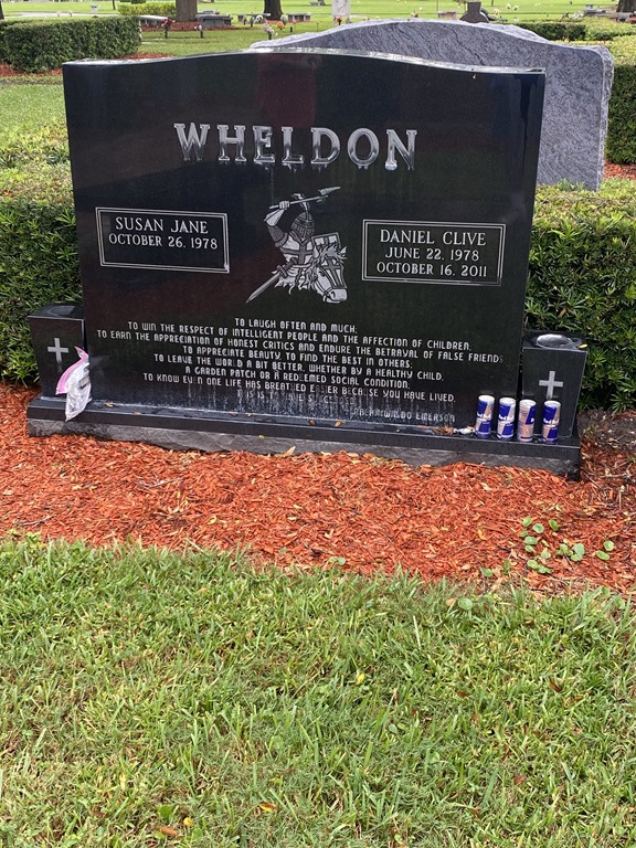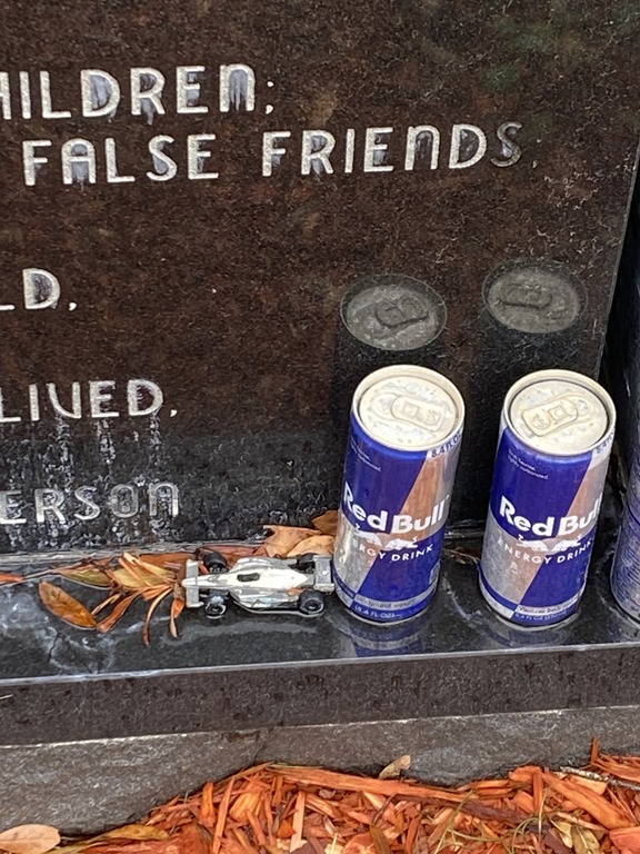 We returned last Thursday to pay our respects, just a few days shy of the eleventh anniversary of his death. The unmarked grave we had visited a decade earlier now had a large black monument with an inscription from Ralph Waldo Emerson. There was also a matching meditation bench to the side, where Susan chose to rest for a few minutes. Some earlier visitors had left a miniature Indy car and a few unopened cans of Red Bull.