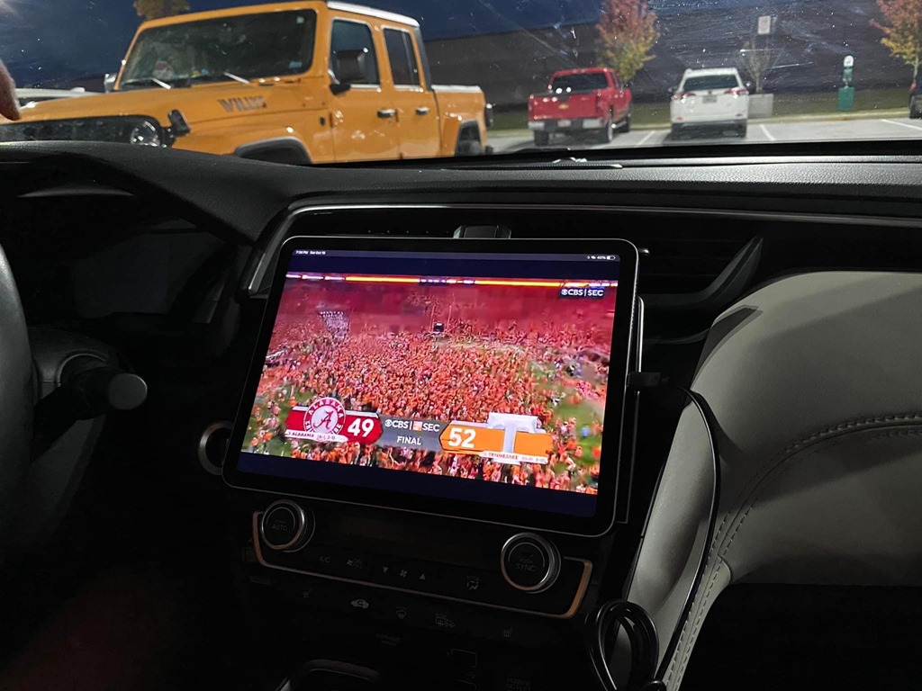 Coming back was different. Tennessee was playing arch-rival Alabama in Knoxville, with our best chance of beating them for the first time since 2006. We rigged up the iPad set-up again and watched the back-and forth affair while navigating the busy roads through Atlanta. It wasn’t as dangerous as it sounded because we were sitting and not moving for most of that time. By the time we reached Calhoun, Georgia, about forty miles north of Atlanta – we needed gas. So we stopped at Buc-ee’s and pulled into the parking lot to sit and watch the last eight minutes of the game, which Tennessee won 52-49. When the knuckleball field goal barely made it over the crossbar, we could hear cheers all through the parking lot as fifteen years of futility against the Tide came to an end. Susan snagged a picture of our makeshift viewing just after the game had ended.