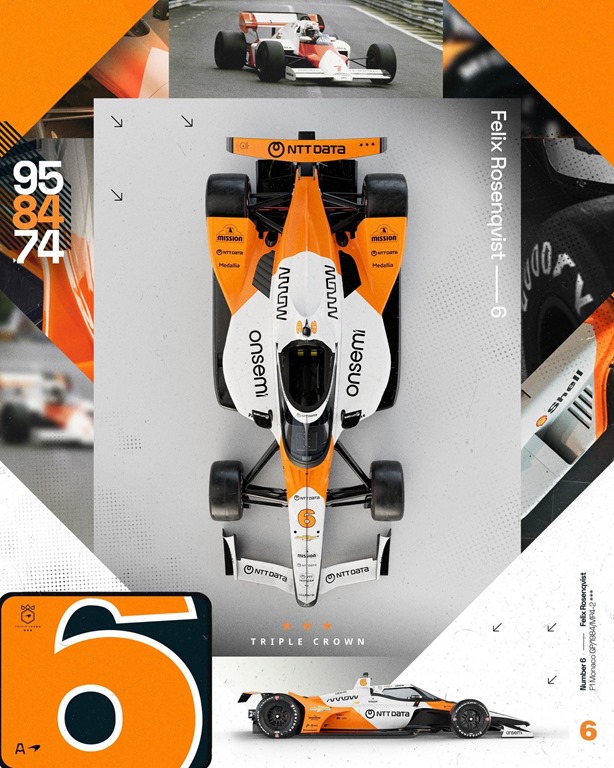My personal favorite is the No. 6 for Felix Rosenqvist, which will feature the familiar Marlboro chevrons that graced the 1984 McLaren that was the first McLaren to win Monaco in Formula One. This scheme was also famous in IndyCar from the late 80s through 2009. Instead of red, the chevrons will be McLaren’s signature papaya orange. (Photo: McLaren Racing)