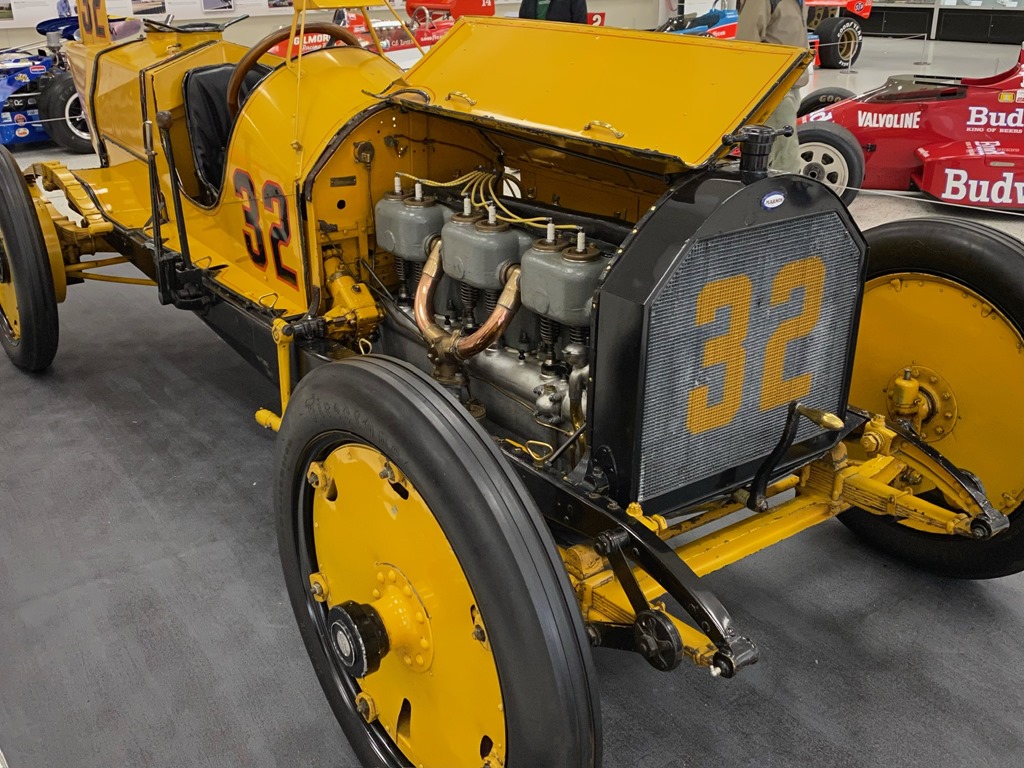 There were two open-hooded cars that I found most fascinating. The first was the Marmon Wasp. In 2008 I remember seeing the hood open on Ray Harroun’s Marmon Wasp, the car that won the first Indianapolis 500 in 1911. It was a massive set of six cylinders, that had been cast in pairs. The engine appeared to be coal black. I didn’t know if that was the original color, or if oil and soot had collected on it over the years, giving it that grimy appearance. There is a different engine in there now, because the old one blew up in 2011, when Parnelli Jones was driving it around the track in pre-race ceremonies for the 100th anniversary of Harroun’s win. This was the first time I have seen under the hood since then, and the engine has obviously been replaced.