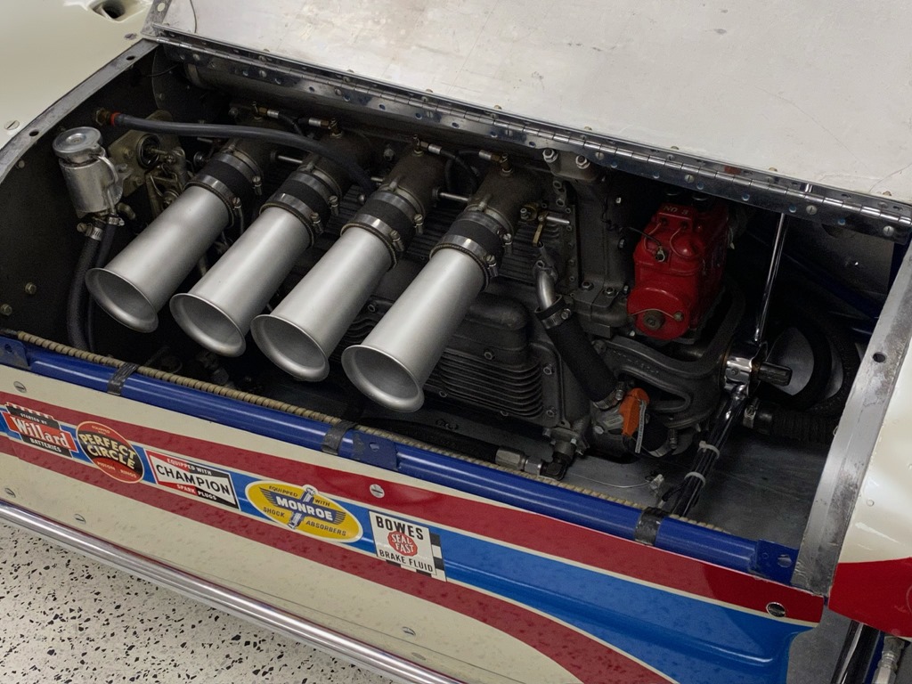 The second open hood that attracted my interest was the Belond Special. The car was driven to victory twice by two different men – Sam Hanks in 1957, and Jimmy Bryan in 1958. Many times, I’ve heard Donald Davidson say that this is his favorite car in the museum. It was a revolutionary design by George Salih, because he took the famous Offenhauser engine and tilted it 72° on its side. That lowered the center of gravity on the car and made for a lower hood in front of the driver. I had never seen inside the hood of this car.