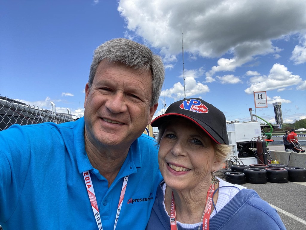 The NTT IndyCar Series practice did not get going until 2:40 this afternoon. By that time, a cool temperate day had turned quite warm. We were hanging around in the pits during practice. As you can imagine, there is not a lot of shade in the pits. But I think the ambient temperature never got over 75°. There was also a decent breeze blowing. What I’m trying to say is that it was almost a perfect day. I do feel the need to share the obligatory selfie of Susan and me, just before practice got started. It was a really good day.