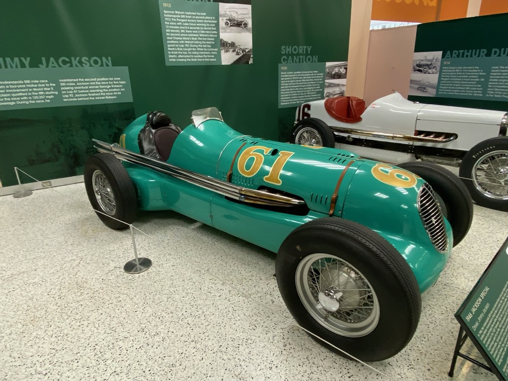 There are at least two winning cars in this exhibit, and the 1950 winner is one of them. Johnnie Parsons drove this car to victory in 1950. In 1951, the car had been sold to Jim Robbins and Mike Nazaruk was the driver. After winning one year, the car finished the following year behind Lee Wallard.