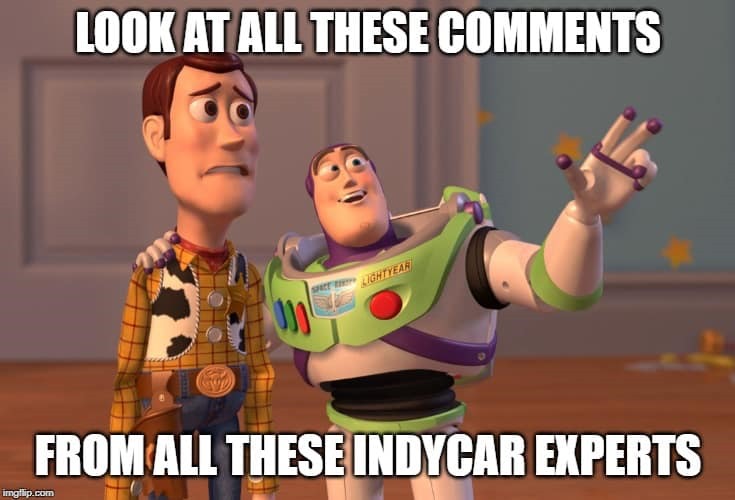 Even Newgarden said he does not like that move being legal, but if Race Control was going to allow it – he would take advantage of it. As far as I’m concerned, that should be the end of the discussion, because there is no controversy. It was a legal move and he did it. But those on social media think they know more. I was so irritated by this, I was moved to borrow a meme from the late Eric Schwarzkop’s Facebook page…